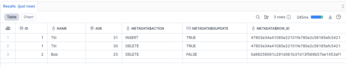 METADATA$ACTIONte dit si la ligne correspond à unINSERTou unDELETE.METADATA$ISUPDATEest à TRUE quand cette ligne fait partie d'unUPDATE(qui est représenté comme unDELETE+INSERT).METADATA$ROW_IDest un identifiant unique par ligne, utile si tu veux suivre la même ligne au fil du temps et voir toutes les modifications.